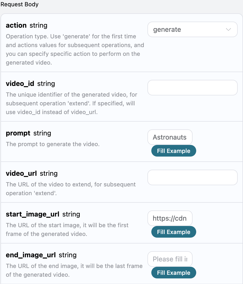generateand extended generationextend, default isgenerate. - start_image_url: Specifies the start frame of the generated video.