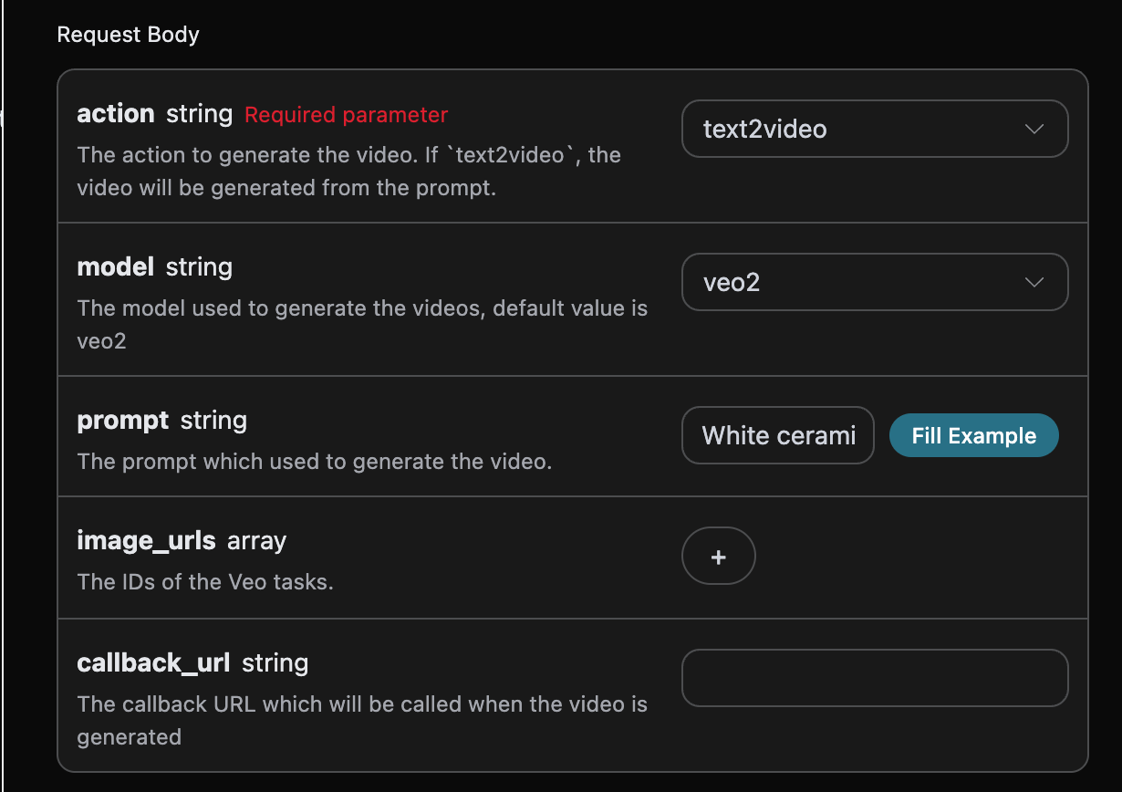 model: the model for generating the video, mainly includingveo2,veo2-fast,veo3,veo31,veo31-fast,veo31-fast-ingredients, andveo3-fastmodels.action: the action for this video generation task, mainly including three actions: text-to-video (text2video), image-to-video (image2video), and get 1080p video (get1080p).image_urls: when selecting the image-to-video actionimage2video, it is necessary to upload the reference image links for the first and last frames, with a maximum of three reference images.prompt: the prompt.callback_url: the URL to receive the callback result.