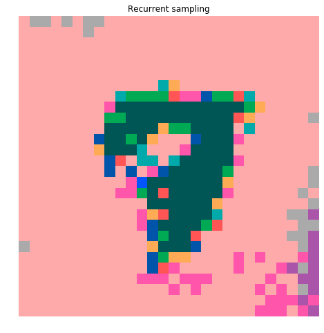 That is a auto-regressive model, which mixes ideas from the two papers Pixel Recurrent Neural Networks (2016) and MADE: Masked Autoencoder for Distribution Estimation (2015) to produce colored 28x28 MNIST digits. Pixel intensities have been quantized to 2 bits (i.e. four intensities for each color channel). The dataset can be downloaded from here.