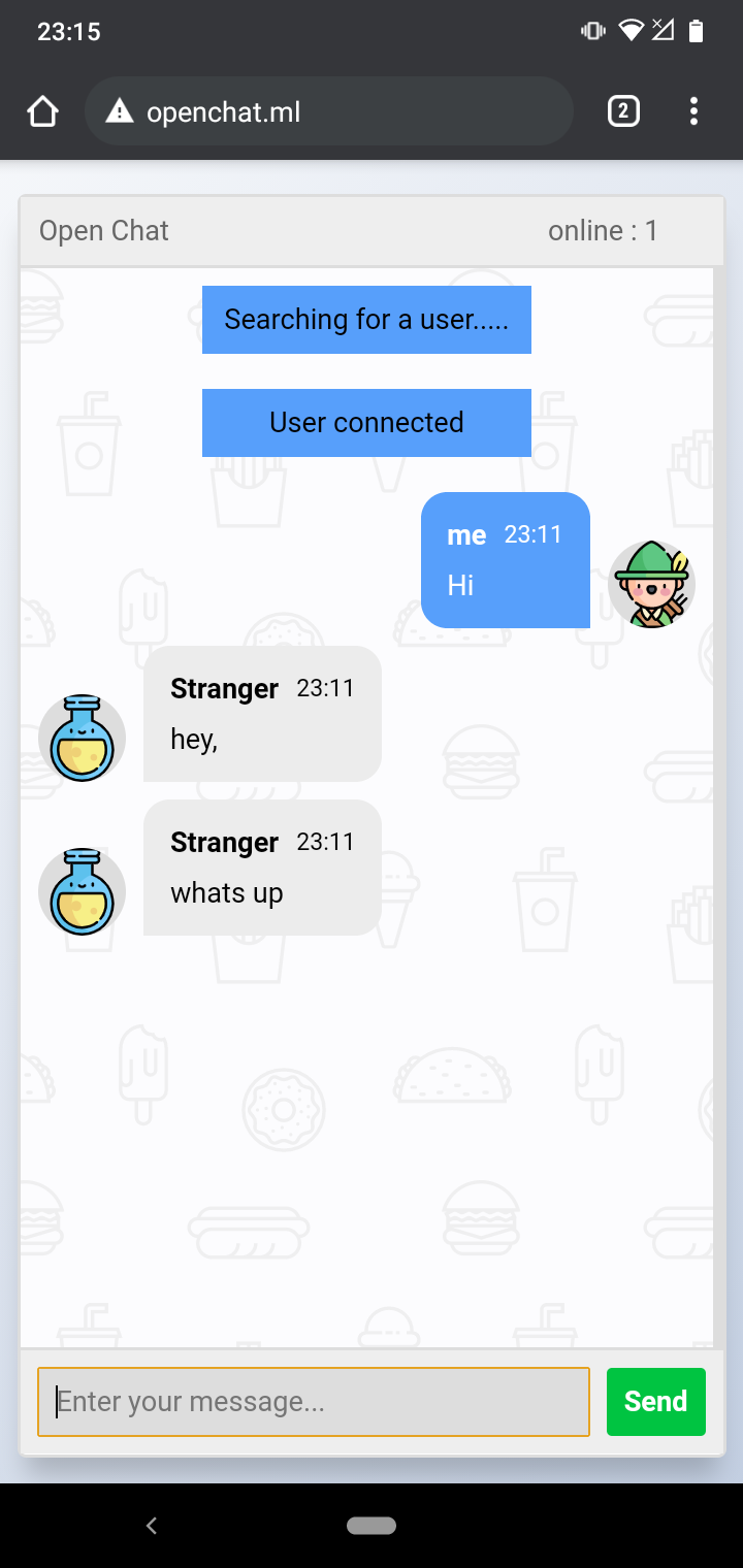 TubeMate Chat with random strangers Demo http://openchat.ml/ How to setup Requirements node 10.x Installation Clone the project npm install node server.js Install with Docker docker pull docker.pkg.github.com/danushka96/openchat/openchat:latest docker run --name tubemate -p 3000:3000 docker.pkg.github.com/danushka96/openchat/openchat:latest