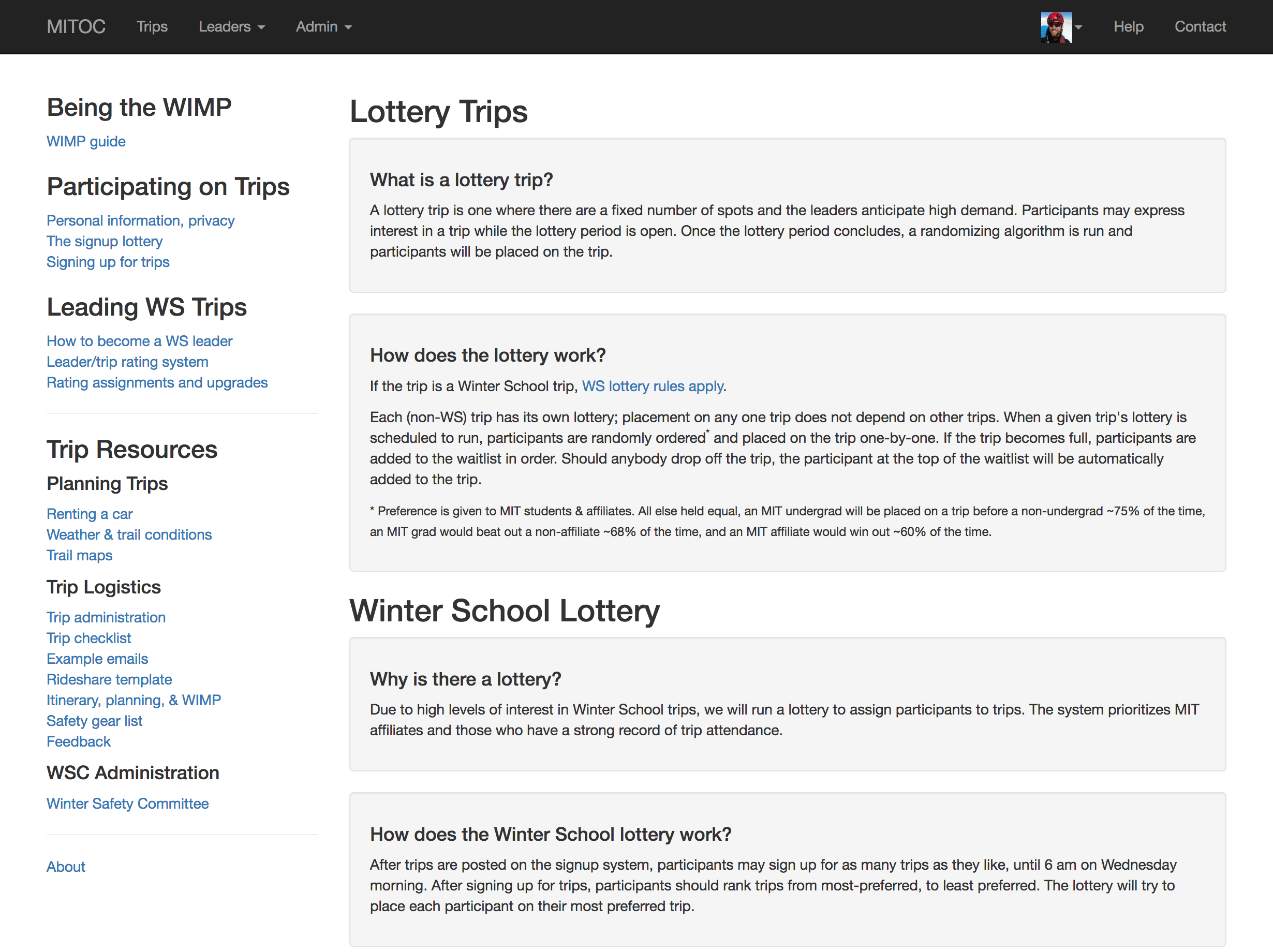 Today, all MITOC trips are organized through this portal. Many trips are first-come, first-serve, but we use lottery-based signups for other popular trip formats once subject to same problems as Winter School.