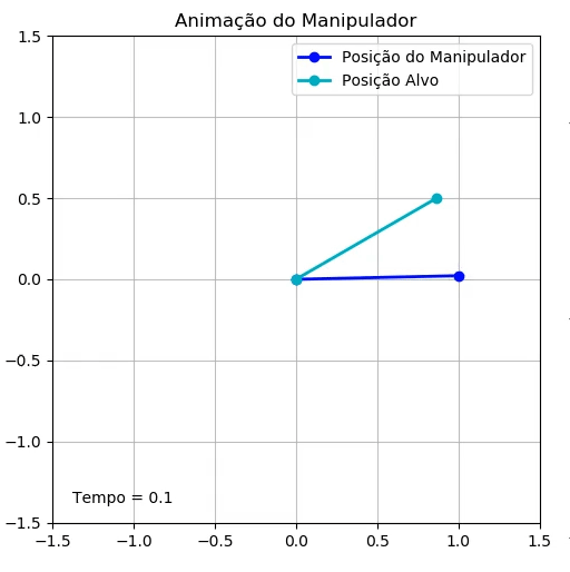 A simulação mostra que de fato o algoritmo é capaz de realizar o controle do manipulador de forma satisfatória. Isso fica ainda mais claro observando os gráficos da simulação, onde pode ser notado que a posição angular converge da maneira esperada para o valor esperado.