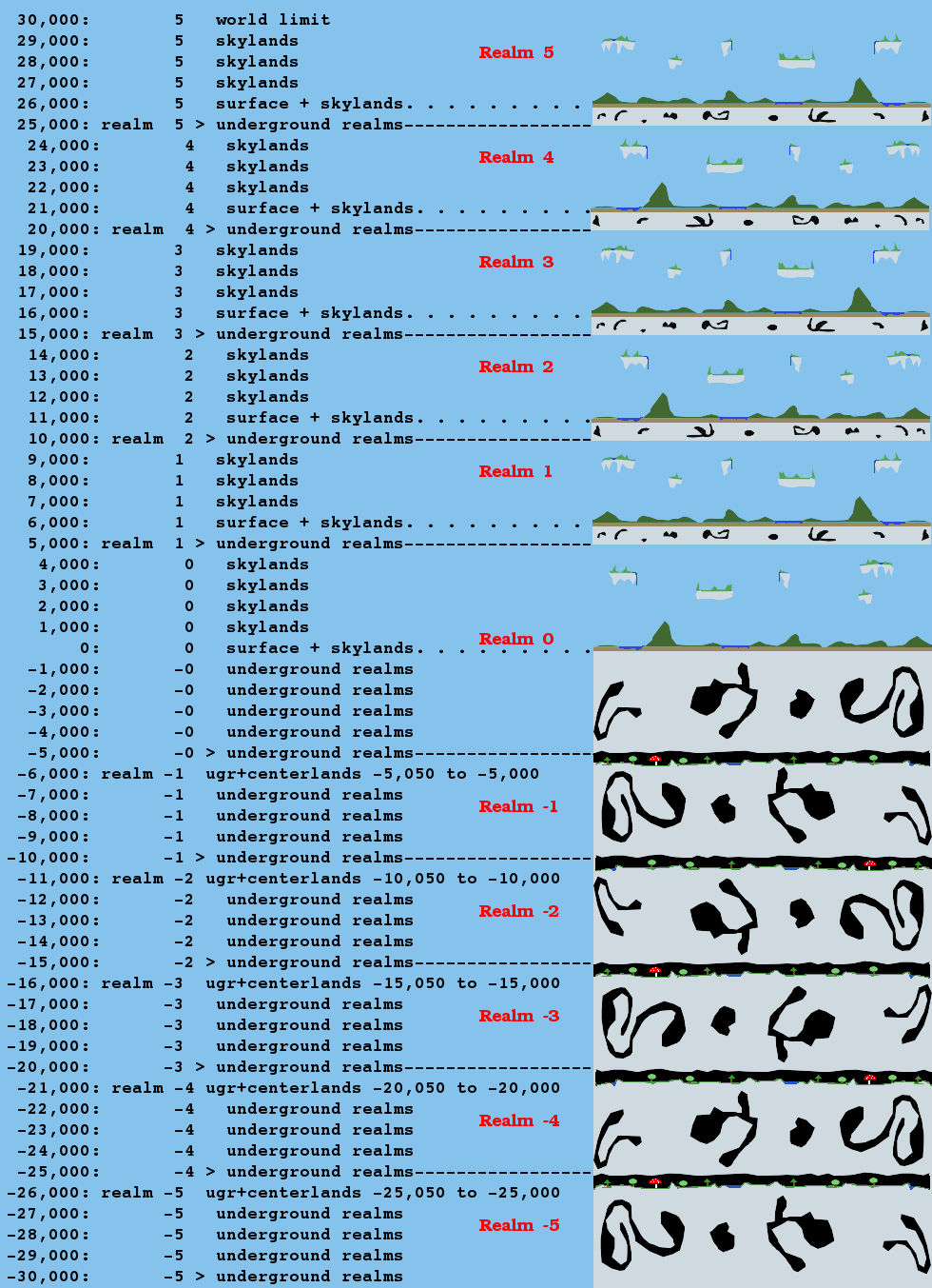 When I first started working on the Fractured game, my vision was of a world with multiple layers, or "realms" going both up and down through the minetest 64k by 64k cube. Like this: