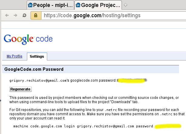 Узнайте свой пароль к репозиториям. Google Code использует генерируемые пароли, они доступны с вашей страницы настроек. Он понадобится вам на следующем шаге.