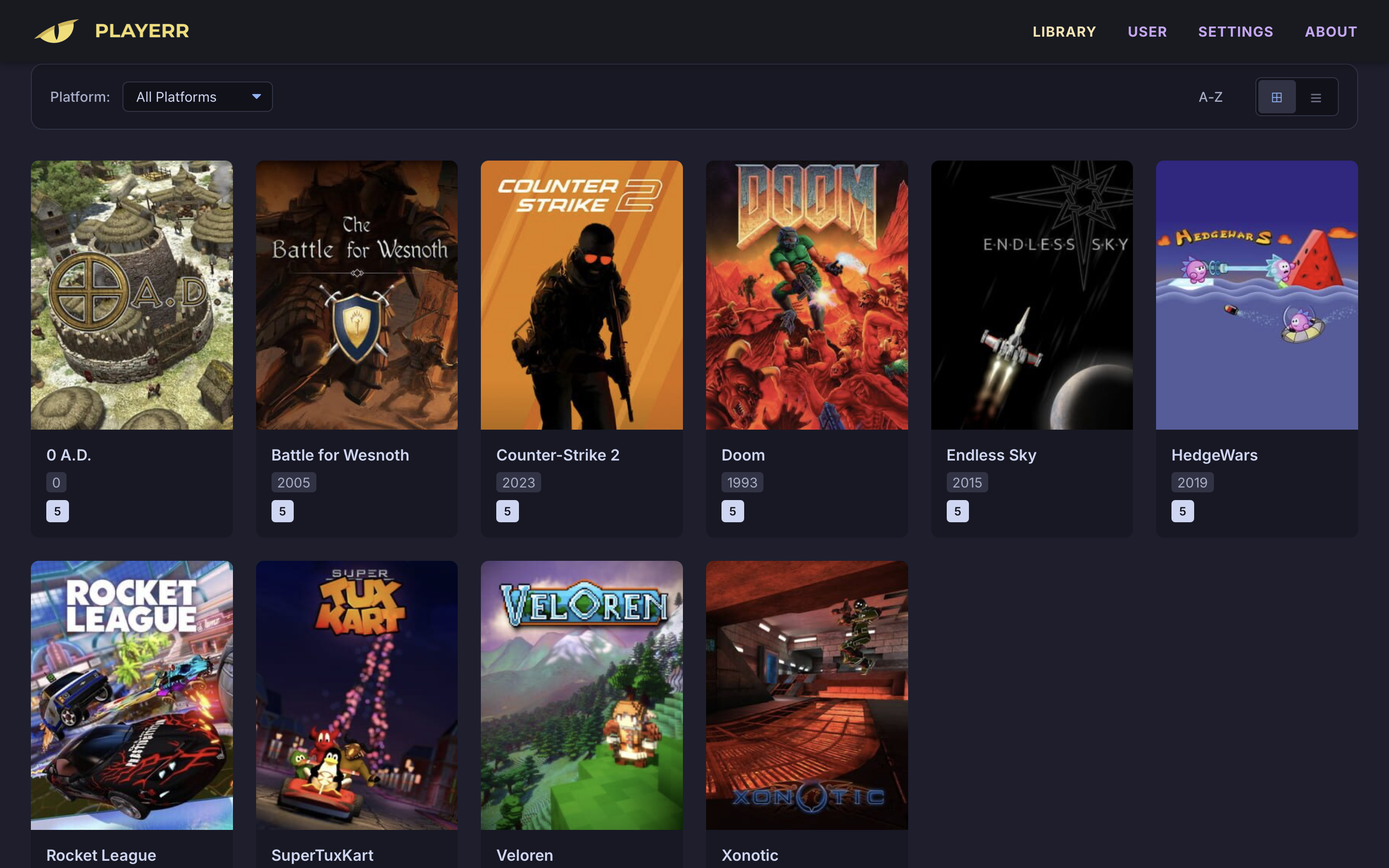 Playerr is an open-source project for educational and personal library management. It is not affiliated with any third-party game platforms or metadata providers. The developers do not condone piracy; users are responsible for complying with their local laws regarding copyright and content usage. See DISCLAIMER.md for the full legal notice.