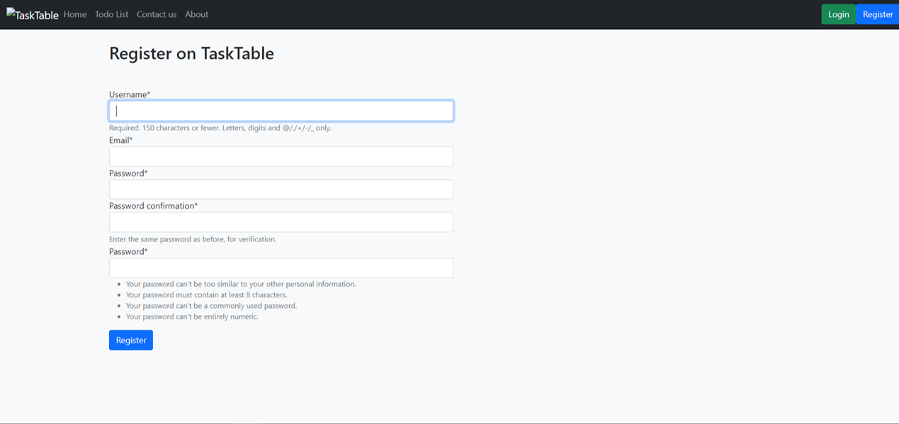 TaskTable is an application that allows to manage a list of tasks to do. It performs adding, updating, deleting and toggling state of each task. It has minimalistic design and basic functionality. Project Features include Password Validation, User Authorization and Authentication and Implements Pagination.