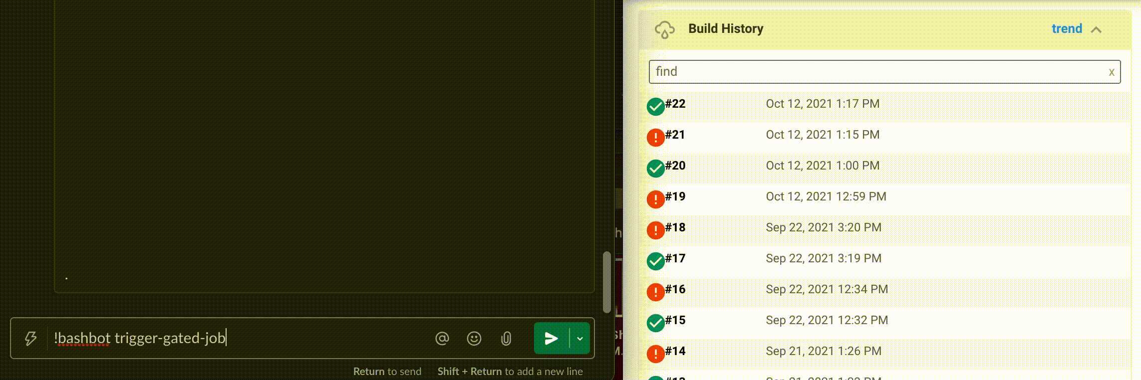 See the Setup/Deployment Examples Repository for more information about how to deploy Bashbot in your infrastructure. In this example, a user triggers a Jenkins job using Bashbot and another instance of Bashbot is deployed in a Jenkins job as a gating mechanism. The configuration for the secondary Bashbot could get info about the Jenkins job/host and provides controls to manually decide if the job should pass or fail, at a certain stage in the build. This method of deploying Bashbot gives basic Jenkins controls (trigger, pass, fail) to users in an organization, without giving them access to Jenkins itself. Bashbot commands can be restricted to private channels to limit access within slack.