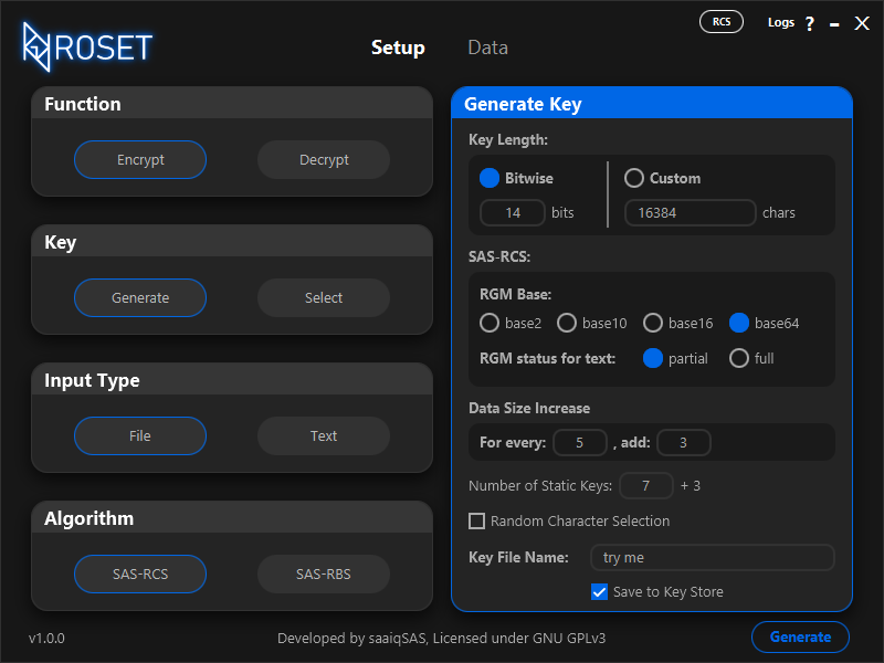 ROS Encryption Tool is a user-friendly encryption application that provides full access to the experimental SAS-RCS and SAS-RBS encryption algorithms. It supports both text and file encryption, including multi-threaded, parallel, multi-point file encryption. Key management is also simplified.