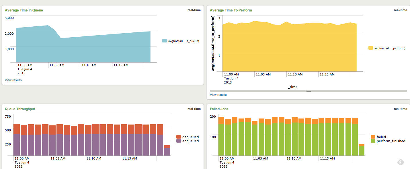This gem simply surfaces this data, and it is left up to other tools using the external data store to search and/or visualize the data. Some examples of other technologies that can be used to visualize this data would be Splunk, Cube and Logstash with Graphite. Coupled with those tools, resque clues will enable you to create views into your background processes like the following:
