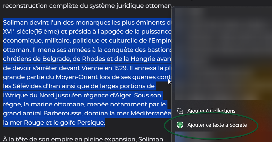 - Séléctionnez un texte, clique droit → Ajouter ce texte à Socrate.