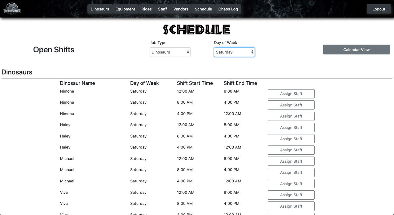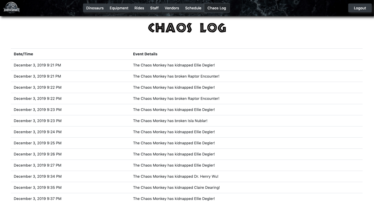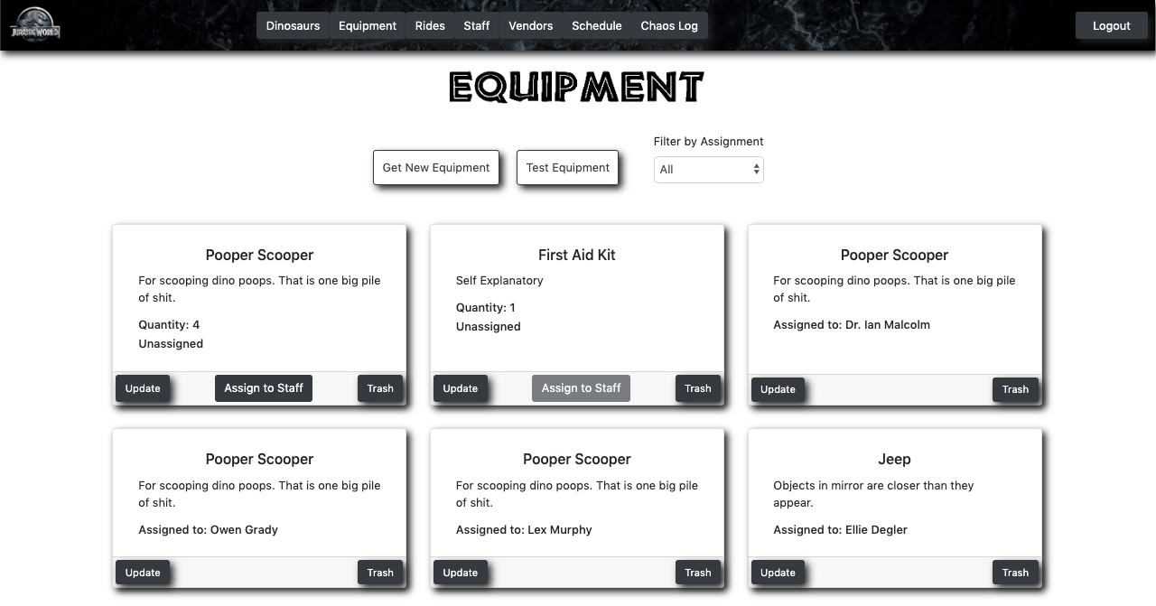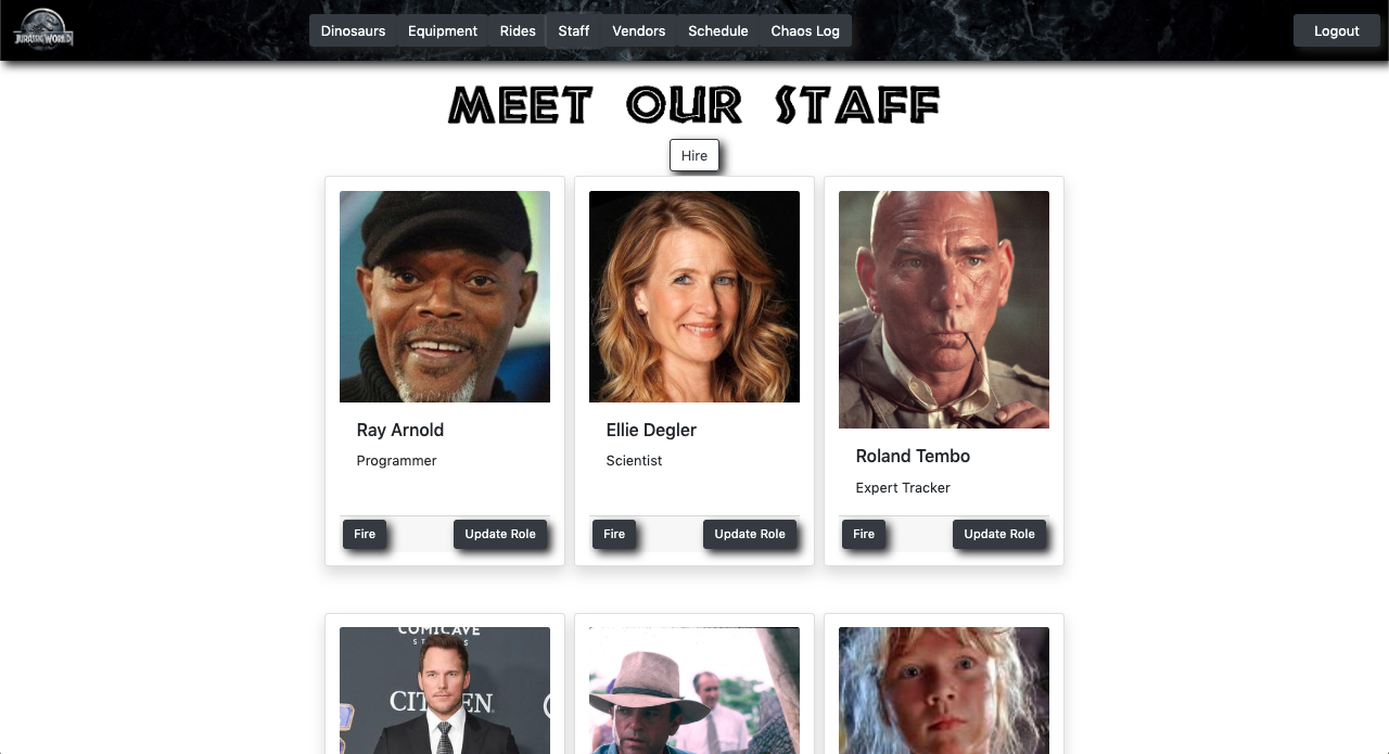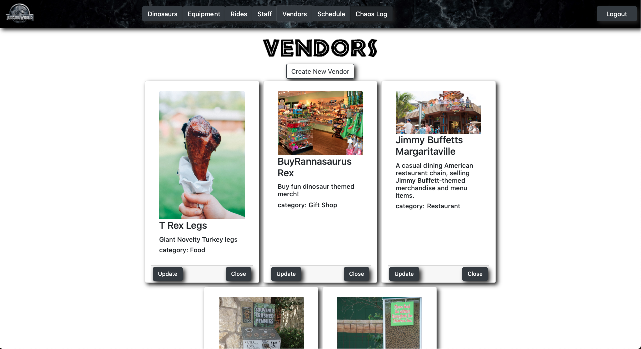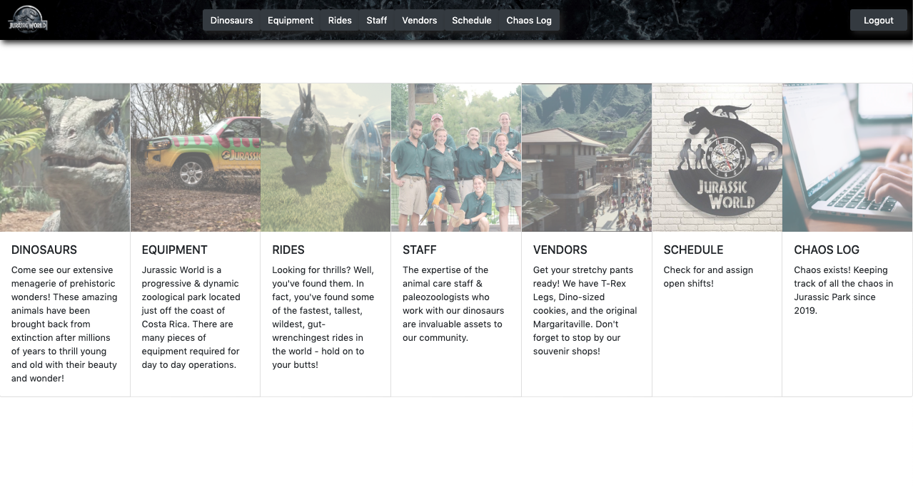 When the user initially visits the page, they will see all the different components that run the theme park. This app allows the user to keep track of the dinosaurs, staff, rides, vendors, equipment, and schedules.