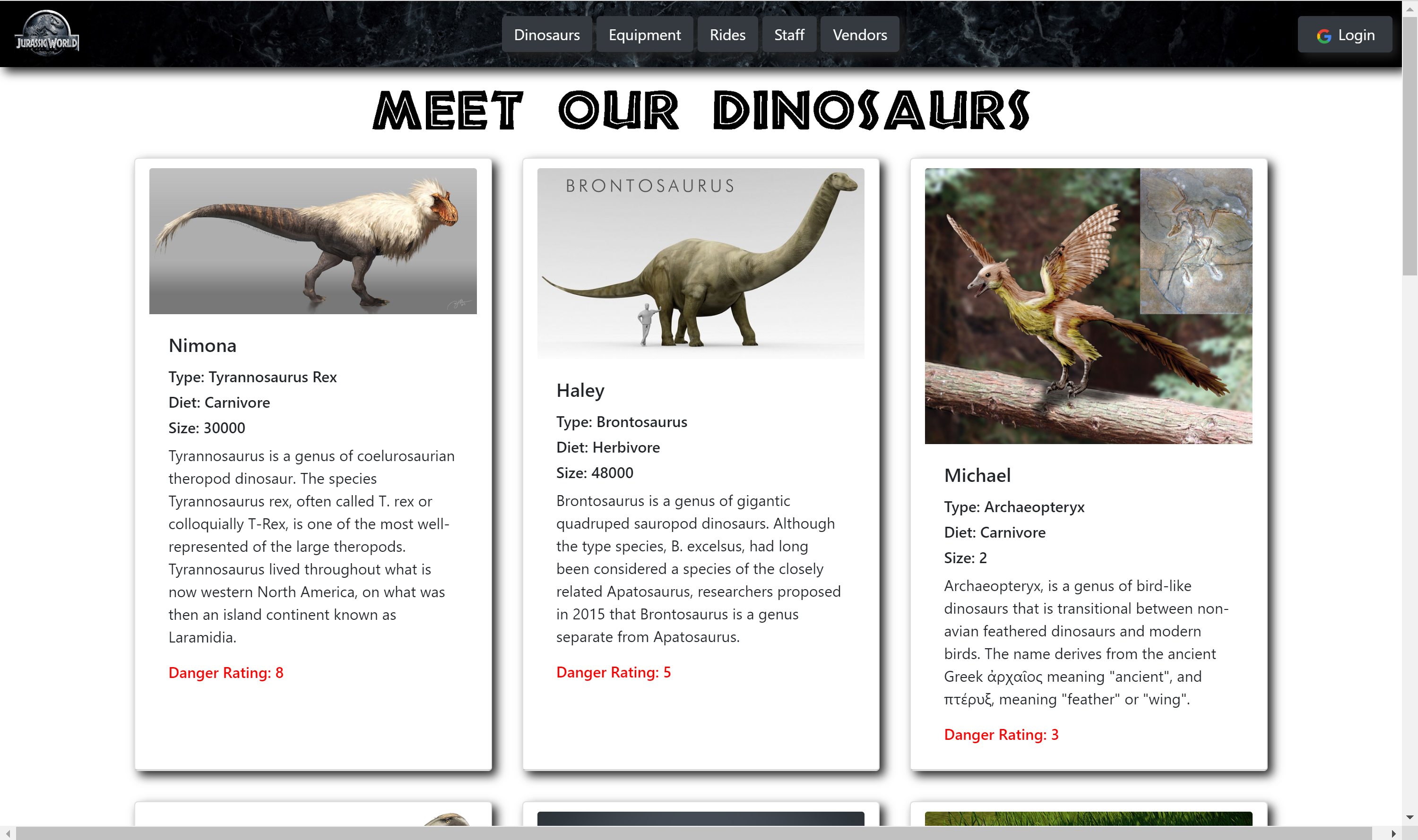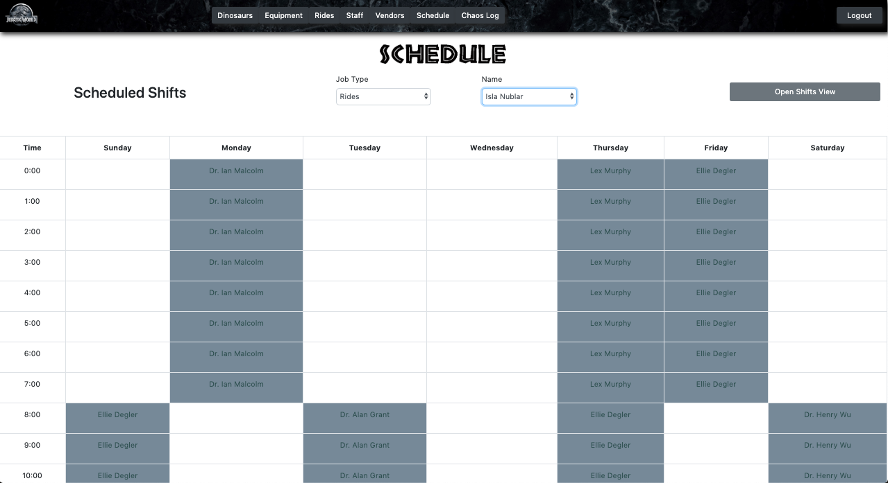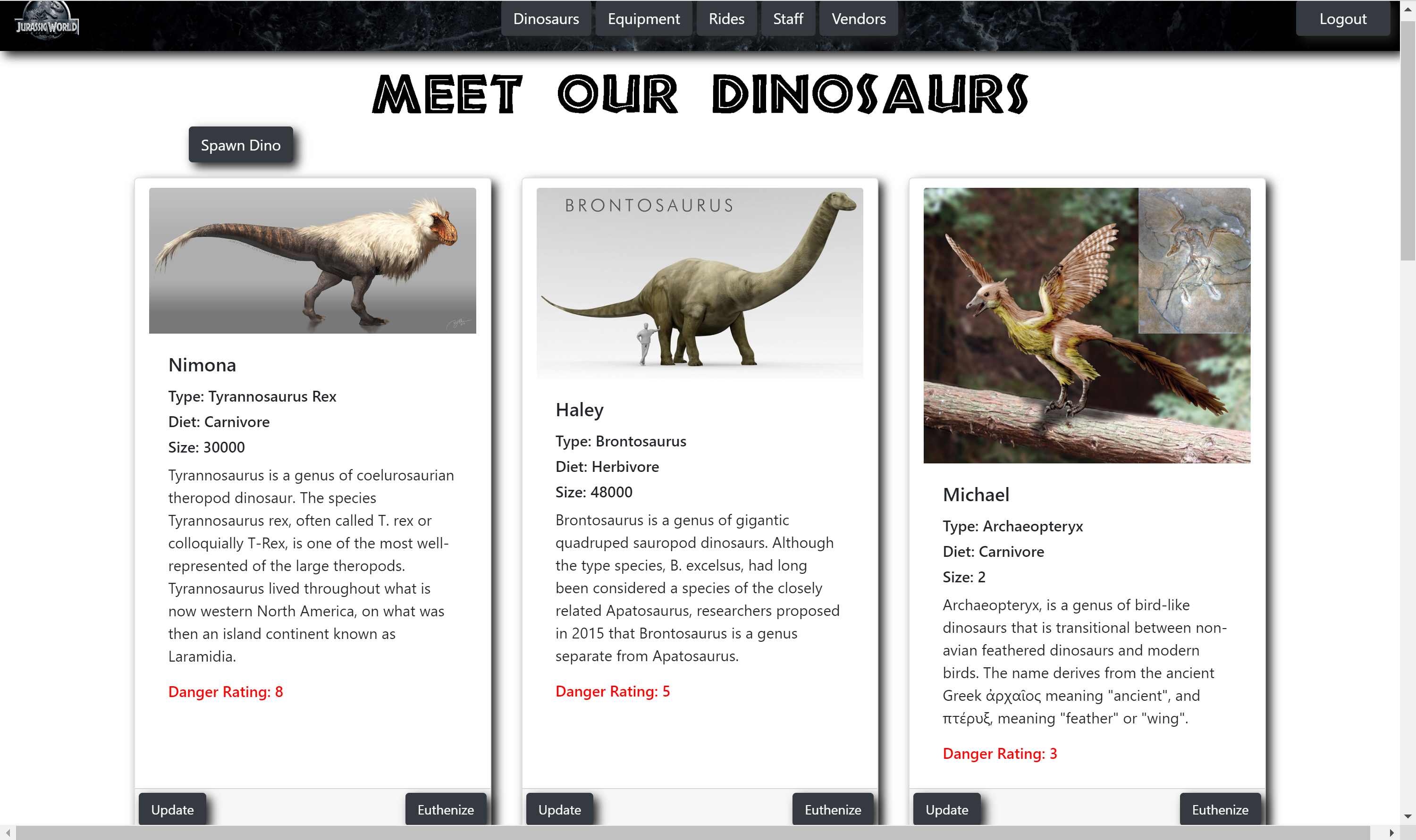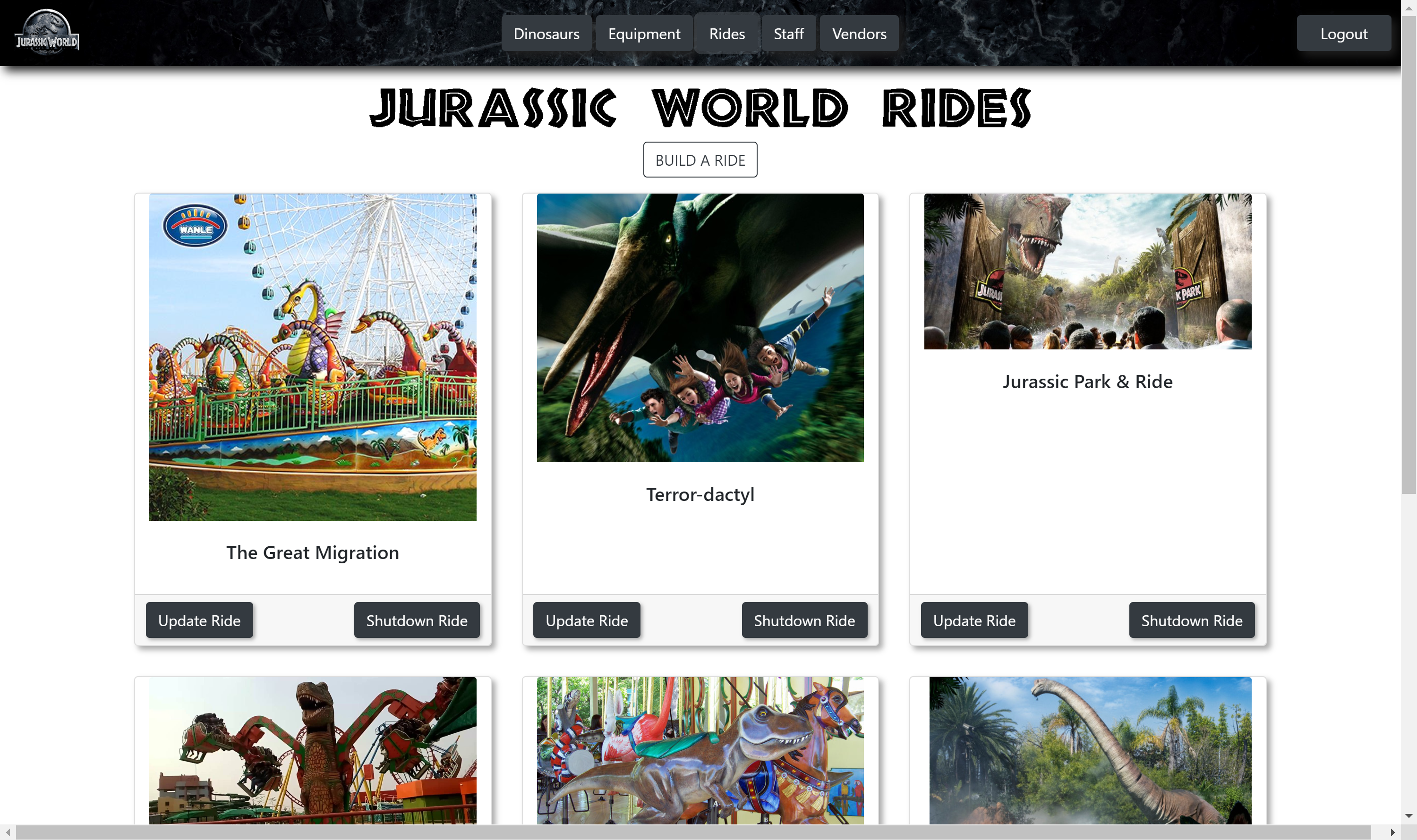 When the user initially visits the page, they will see all the different components that run the theme park. This app allows the user to keep track of the dinosaurs, staff, rides, vendors, equipment, and schedules.