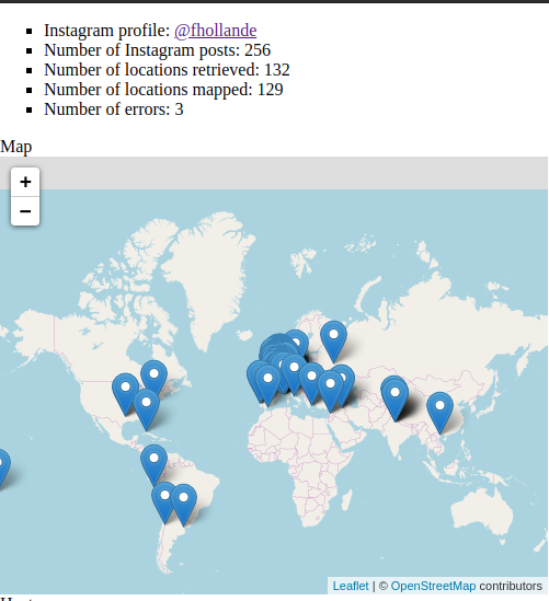 Eventually, once we have all the GPS coordinatess, we generate a HTML (thanks to jinja2 templating) with Javascript embedded that plots an Open Street Map (thanks to Leaflet library) with all our locations pinned. Once again, no API key is required for this step.