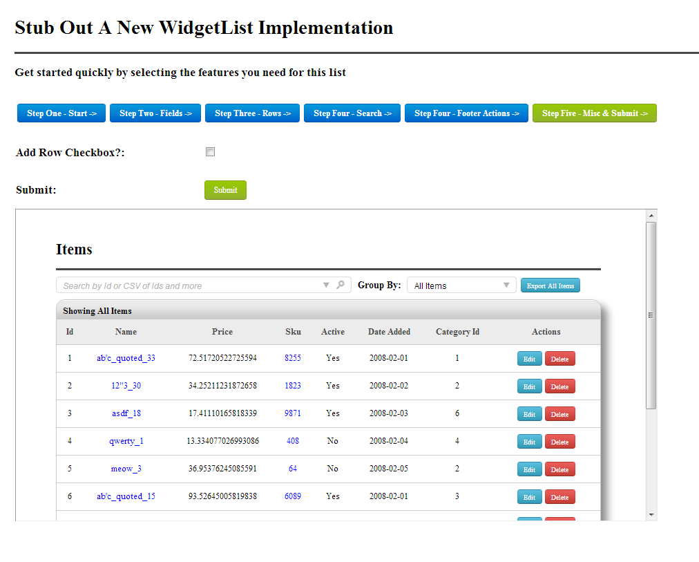 widget_list features and configurations primarily work by a single large hash passed to the constructor with the features you need for the given request which changes how the list is displayed or filtered.