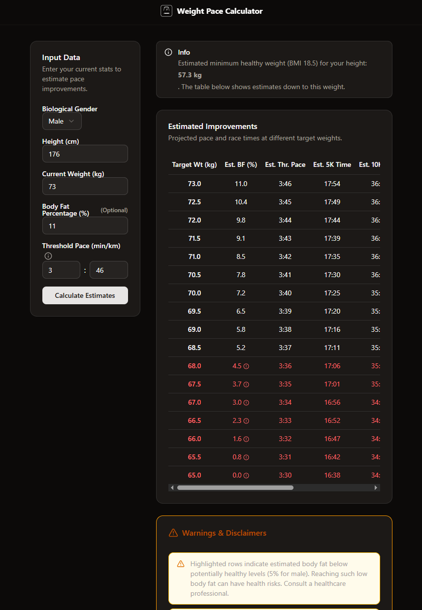 - Pace & Time Estimation: Calculates estimated threshold pace and race times (5k, 10k, Half Marathon, Marathon) for various target weights down to a healthy minimum.