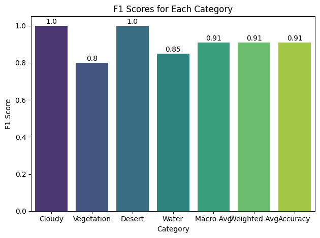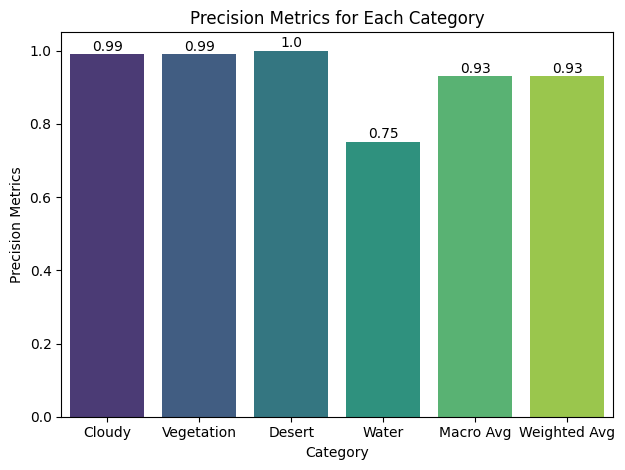 - F1-Score: Close to 1 for 'Cloudy' and 'Desert', lower for 'Green Area' and 'Water'.