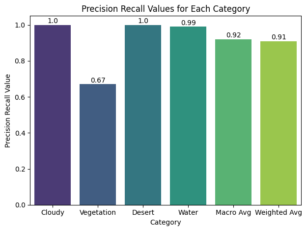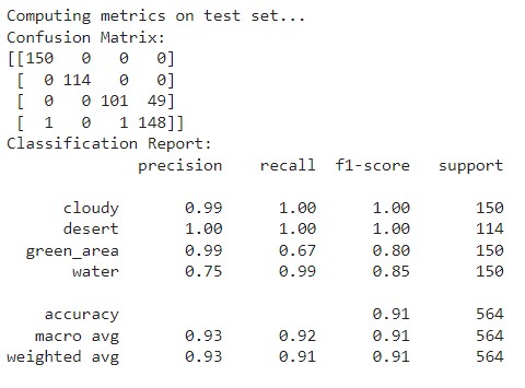 - Recall: High for 'Cloudy' and 'Desert', lower for 'Green Area' and 'Water'.