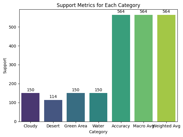 - Support: Balanced for 'Cloudy', 'Green Area', and 'Water'. Lower for 'Desert'.