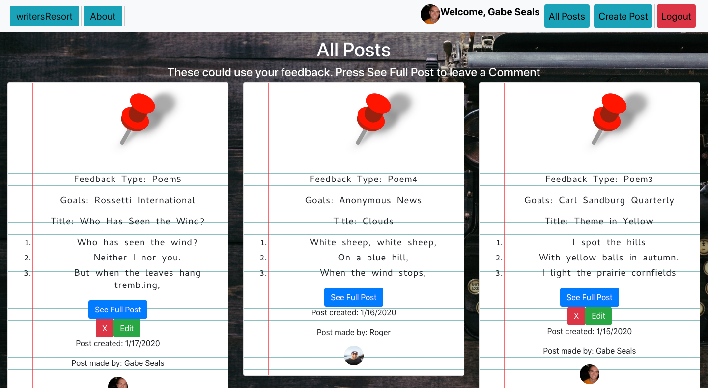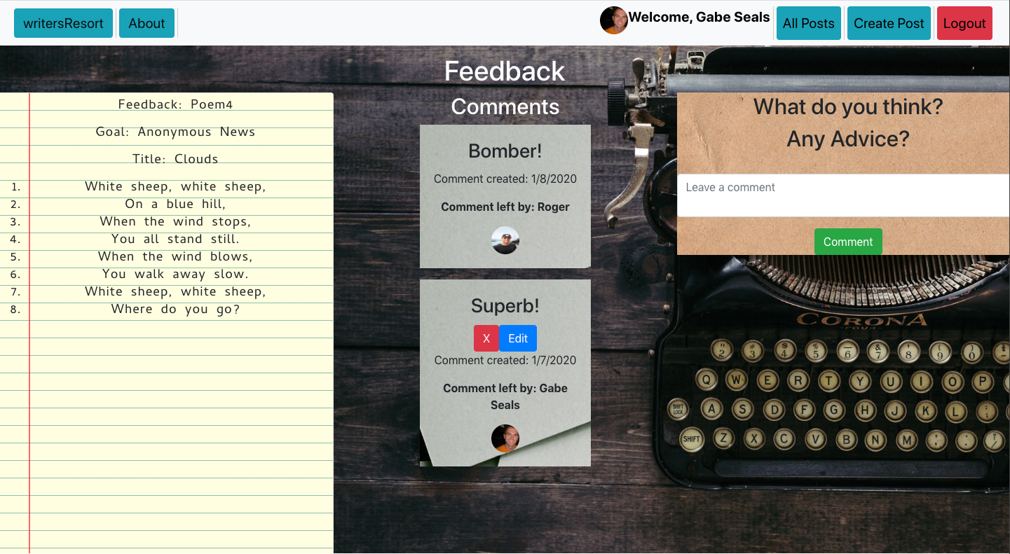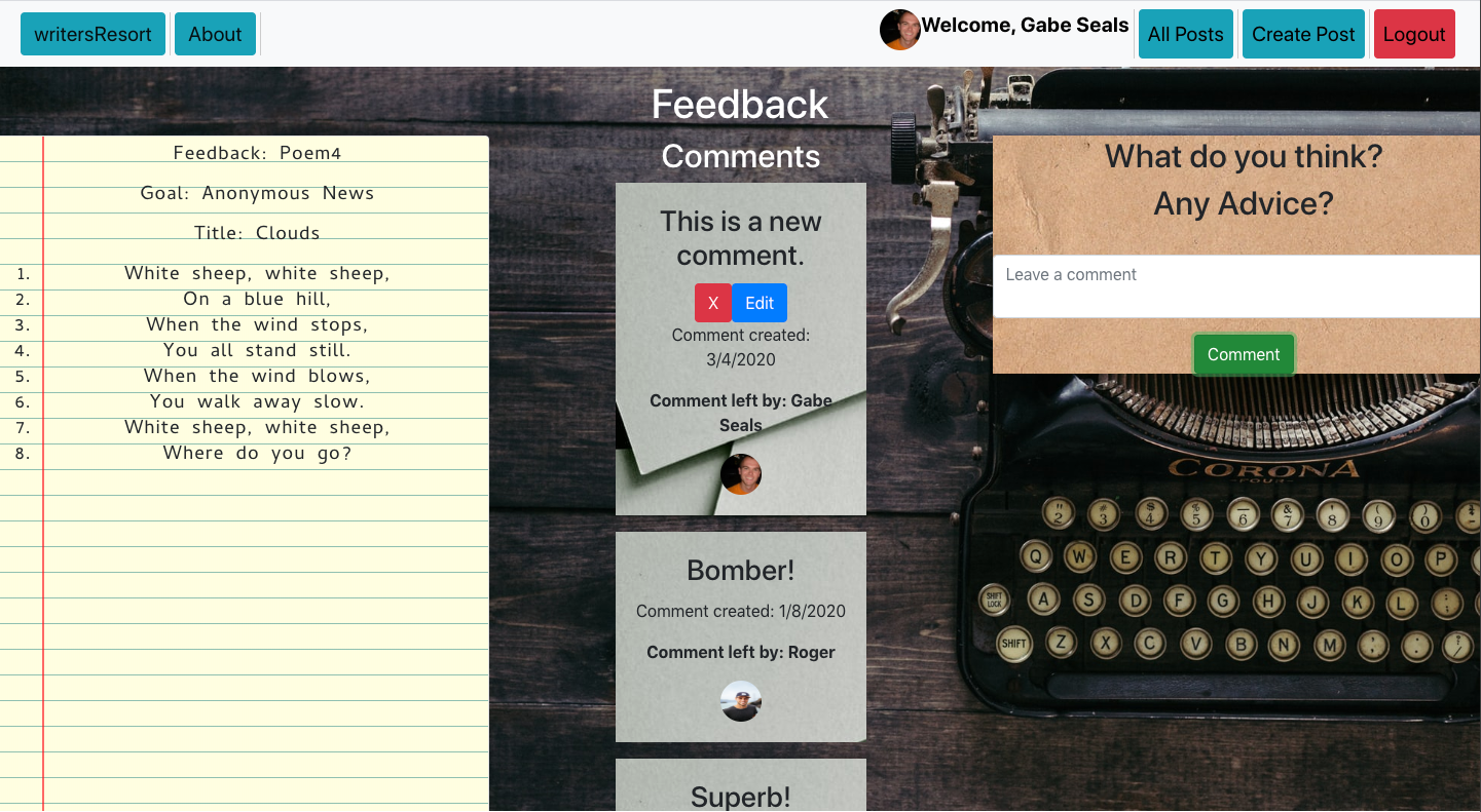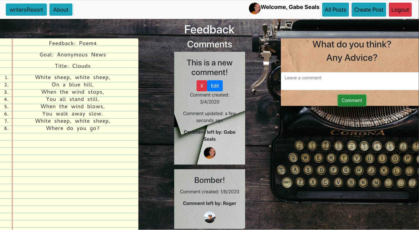 - writersResort allows users to post poems and invite feedback on those poems. Each user has access to edit and delete their own posts or comments, via Axios calls. Each deleted post also deletes any comments associated with the post. Authentication occurs through Google and pulls user's displayURL and Google Username. Each post/comment is stamped with the time it was created and updated.