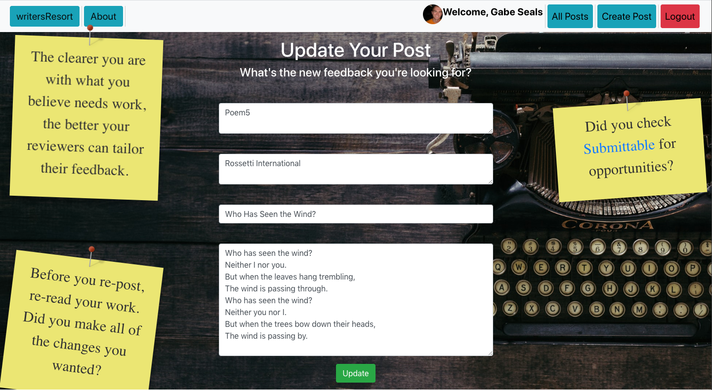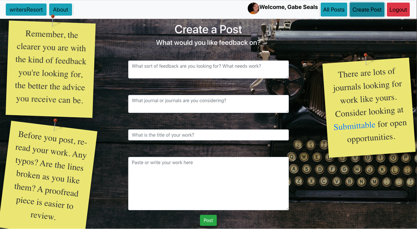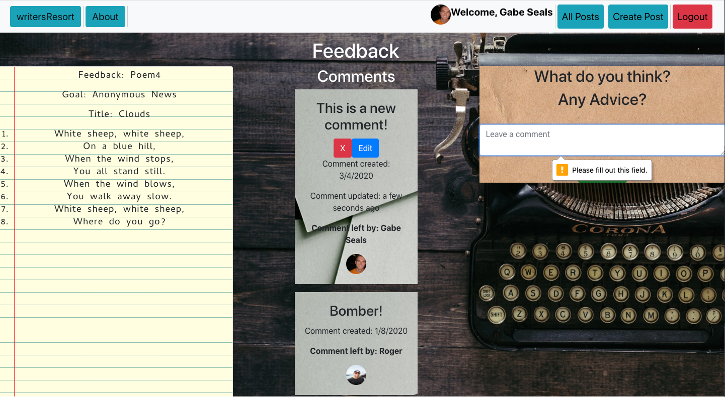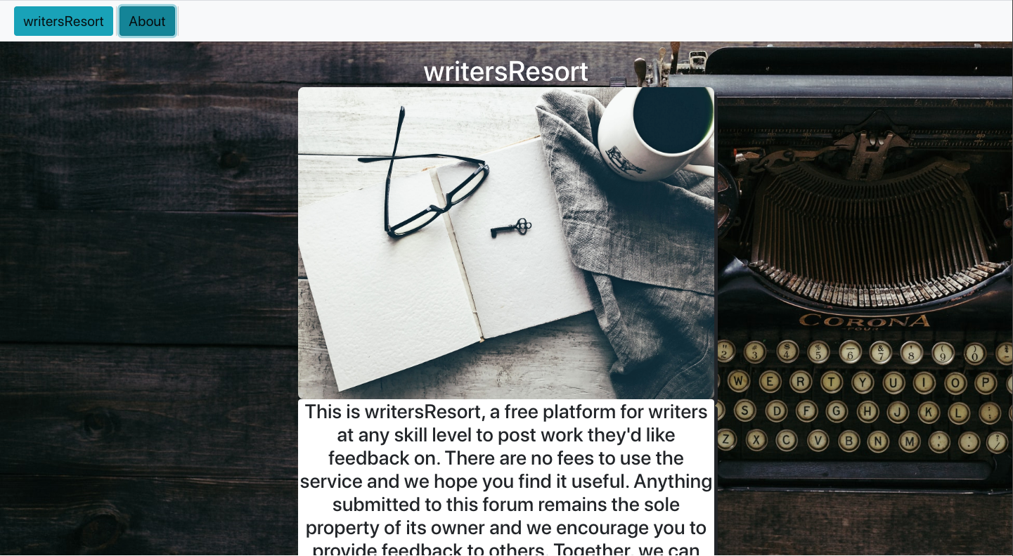 - writersResort allows users to post poems and invite feedback on those poems. Each user has access to edit and delete their own posts or comments, via Axios calls. Each deleted post also deletes any comments associated with the post. Authentication occurs through Google and pulls user's displayURL and Google Username. Each post/comment is stamped with the time it was created and updated.