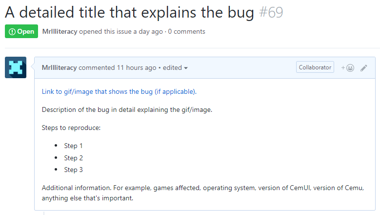 Given that this project is still very early in development, bugs will probably be common, and vary from person to person. If you find a bug, we ask that you follow this format for reporting the bug on the Issue Tracker on the repo: