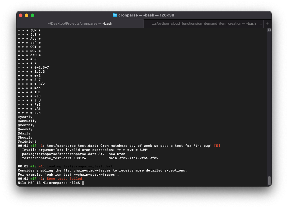 00:01 +13 -1: test/cronparse_test.dart: Cron matchers day of week we pass a test for 'the bug' [E]