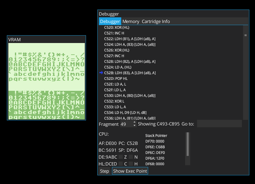 - VRAM viewer and initial GPU emulation (tilemap rendering)