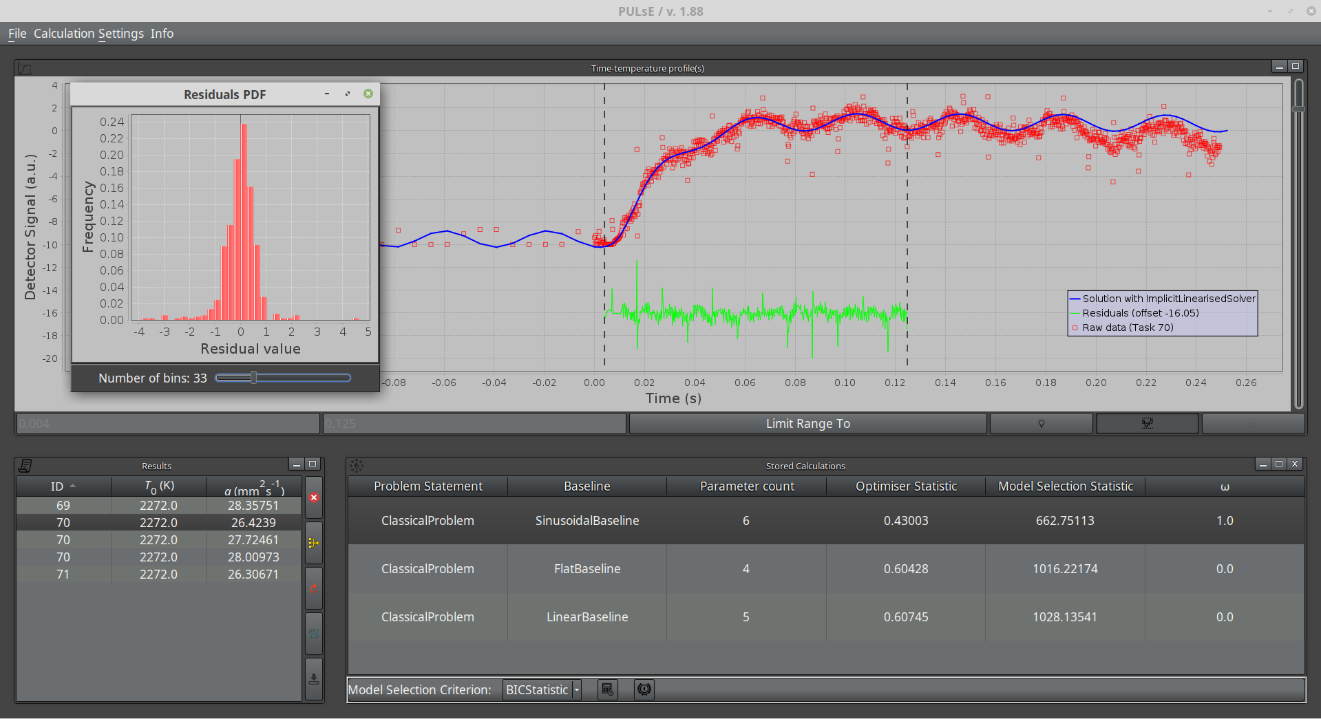 PULsE (Processing Unit for Laser flash Experiments) is an advanced analysis program for processing data from laser flash experiments, allowing effective treatment of difficult cases where conditions may not be ideal for simpler analysis. PULsE analyses the heating curves, calculates and outputs the thermal properties of the sample, such as the thermal diffusivity, based on the inverse solution of a heat transfer problem. The software is specifically tailored for use in the Materials Research Facility at UKAEA, and reads standard ASCII files generated by the Linseis LFA systems; it was initially designed to read custom file formats from a different apparatus designed at the Moscow Engineering and Physics Institute. It is therefore intended for use with any LFA instruments as an alternative to the standard, often simplistic software.