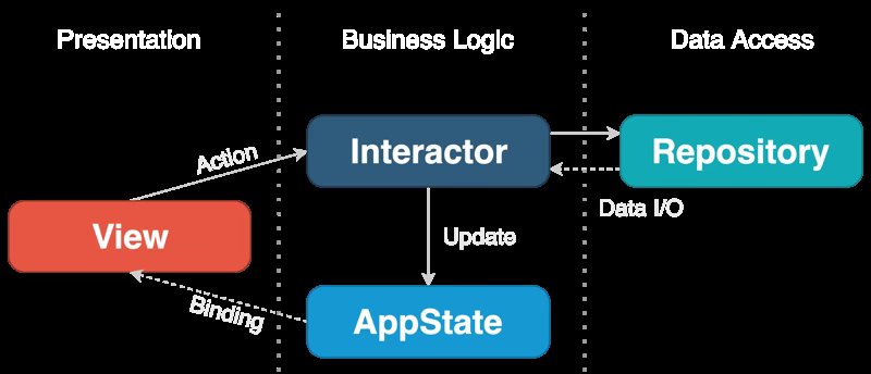 The final layer for clean architecture is the view. It holds references to the interactor to dispatch actions and the AppState in order to properly re-render views when AppState changes.