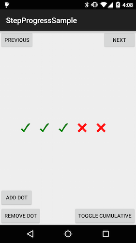 mStepProgressBar.previous();- To set the dots to be cumulative (all dots <= the specified index will show as active), call