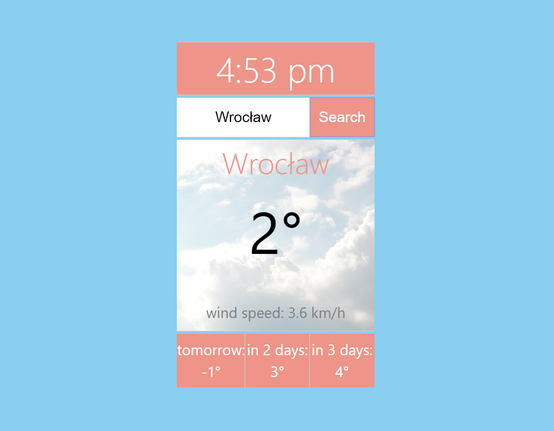 The app displays today's weather and time in a searched city as well as weather for upcoming 3 days :)