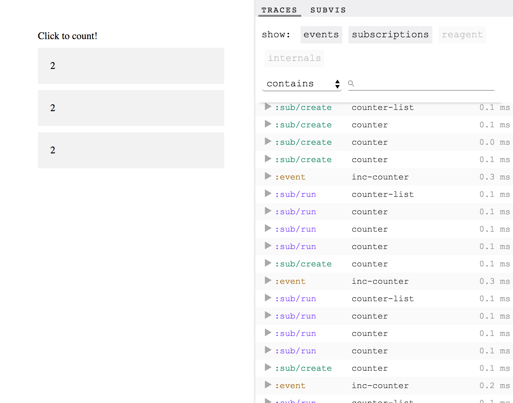 re-frame-trace provides visibility into re-frame applications, showing you exactly what's going on under the hood.