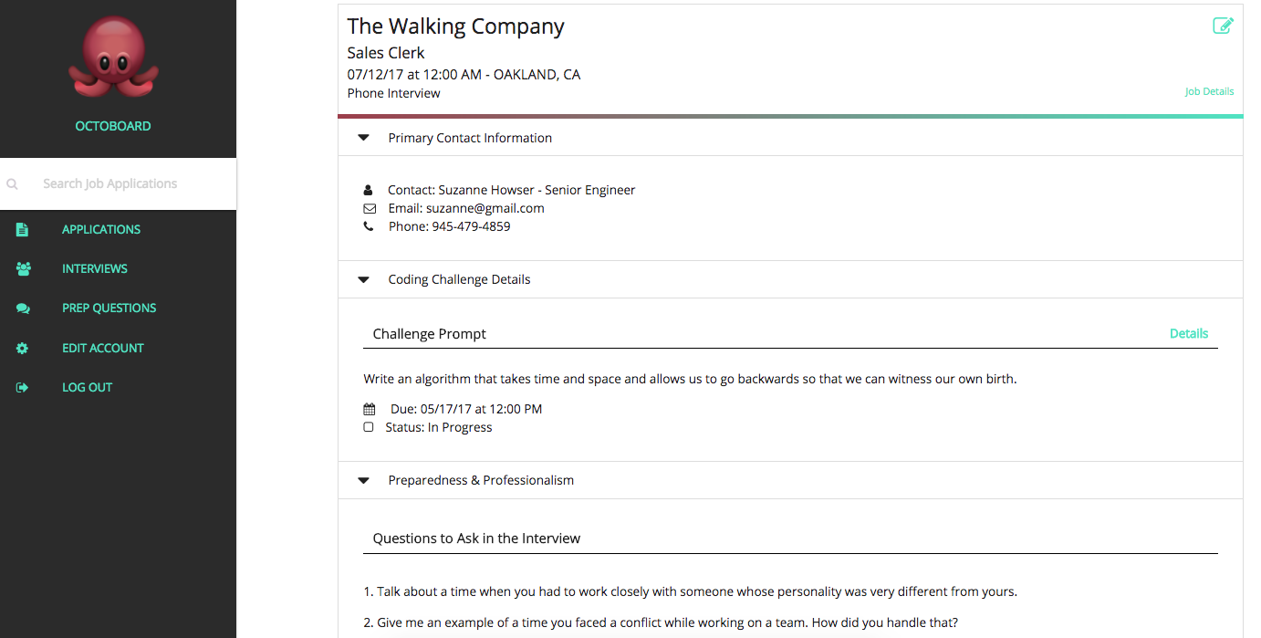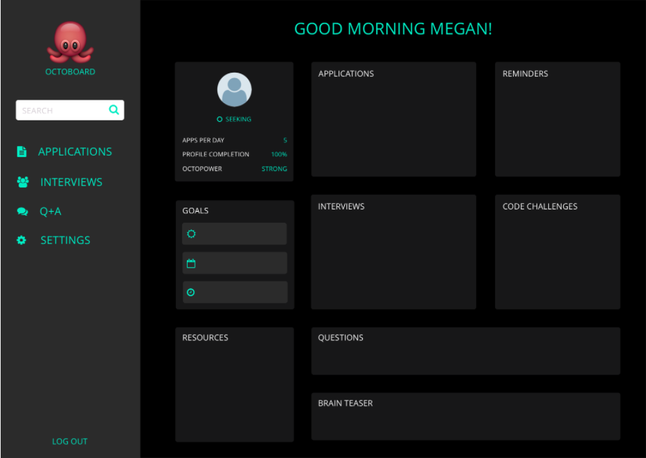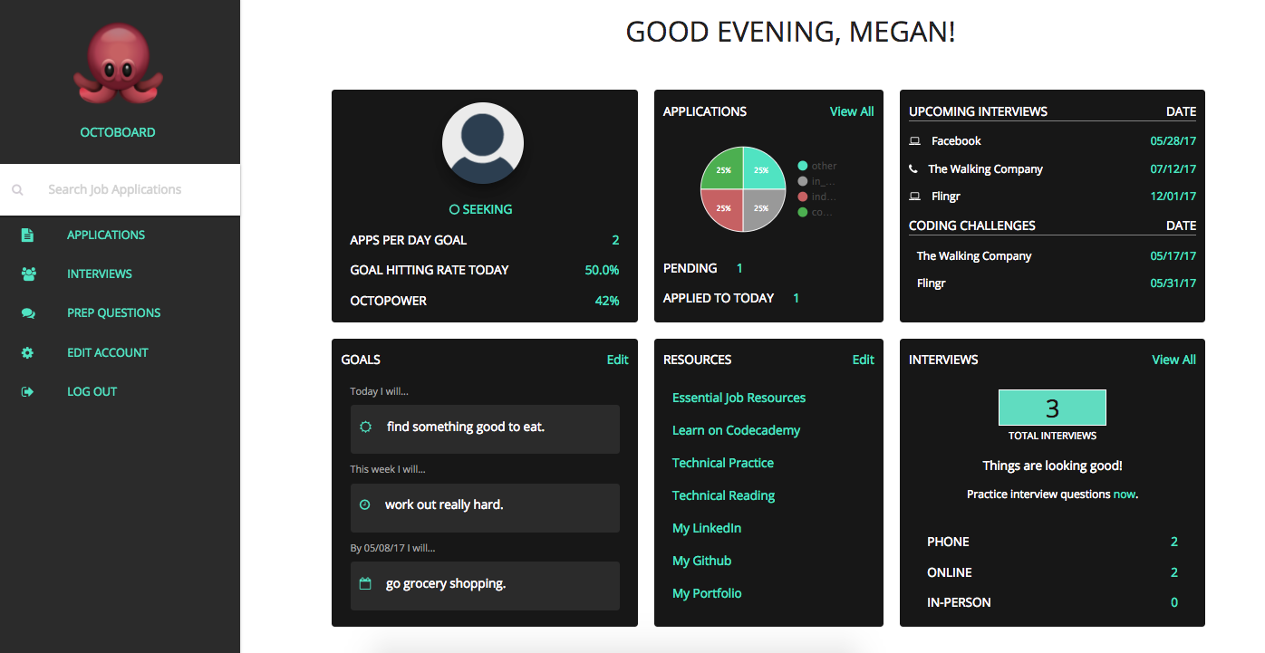 OctoBoard is a personal organizational tool for job seekers which stores information on job applications, upcoming interviews, follow-up dates, and job preparedness aspects such as interview questions and responses. I decided to build this app because it solves an issue that many people face when trying to organize job search process details while encouraging better preparation and practices.