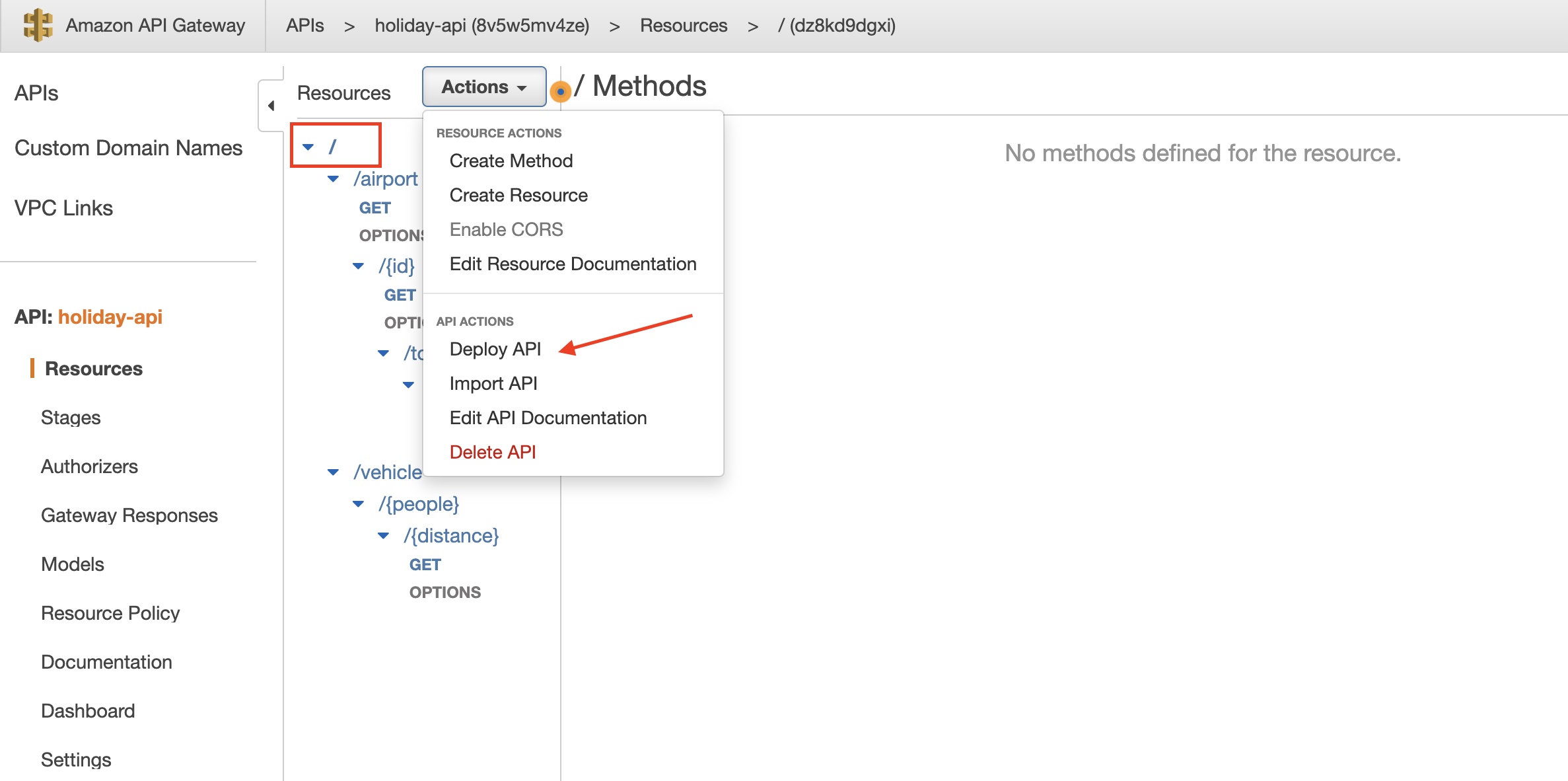 Execute the 'Deploy API' button for the root resource ('/') from the AWS API gateway console.