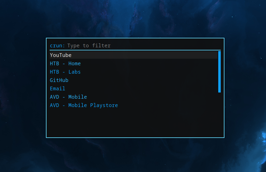 Crun is a Rofi plugin used to run custom applications. As opposed to desktop files, this allows quick configuration in ~/.config/rofi/crun.json (See provided sample configuration).