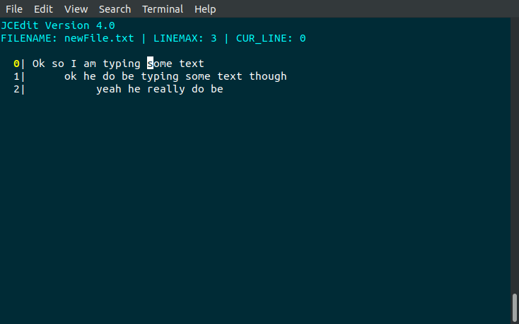 By default jcedit will be in command mode. In command mode you can enter and make use of various commands (see below.)