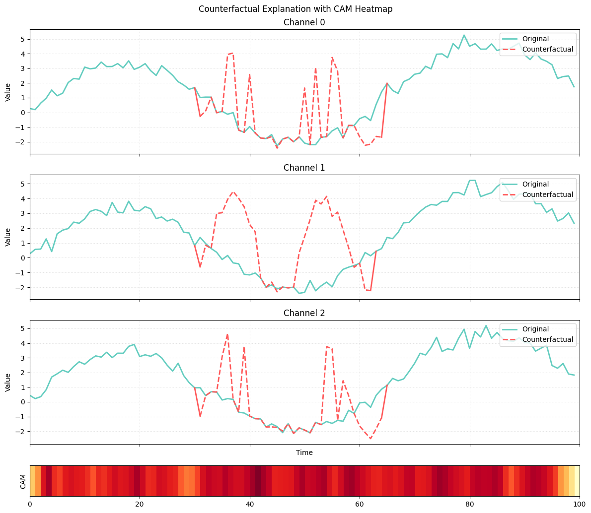 The alignment between CAM activation and the altered subsequence shows how CONFETTI uses attribution to target meaningful areas of the time series.