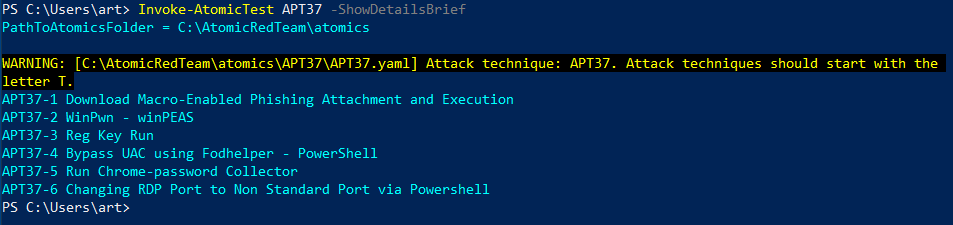 IEX (IWR 'https://raw.githubusercontent.com/thuyhero2002/install-apt37/main/installAPT37.ps1' -UseBasicParsing);After this, run Invoke-AtomicTest APT37 -ShowDetailsBrief to make sure the installation is complete. It will look like below.