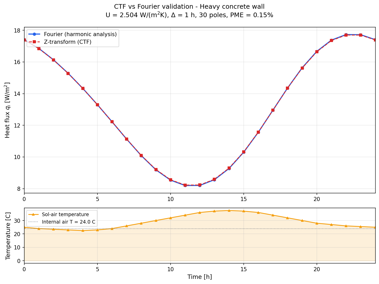 Validation example: comparison between the Z-transform (CTF) output and the independent Fourier (harmonic analysis) reference solution for a heavy concrete wall (plaster 2cm + concrete 25cm + plaster 2cm), subjected to a periodic temperature profile. The two curves are virtually indistinguishable (PME = 0.15%), confirming that the selected set of poles and residues accurately represents the wall's thermal dynamics. Once these coefficients are computed, they can be reused with any arbitrary input signal.