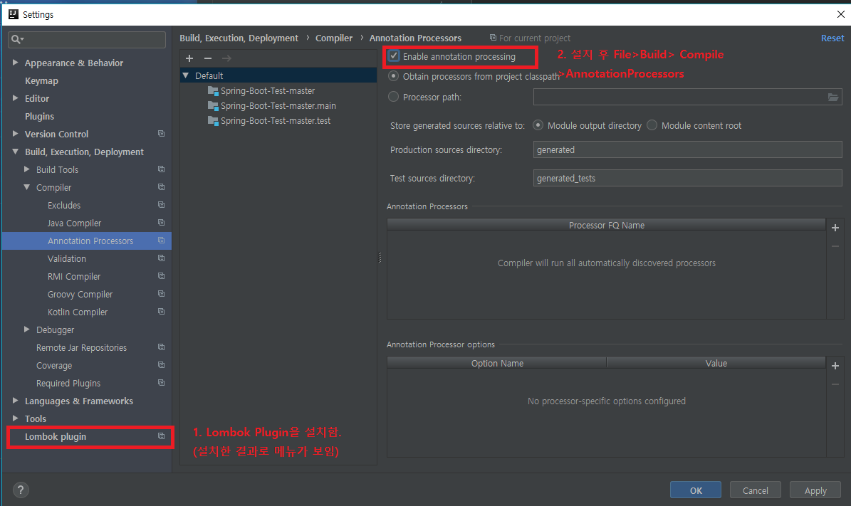 - File > Settings > Compiler > Annotation Processors 에서 활성화를 하면 됩니다.