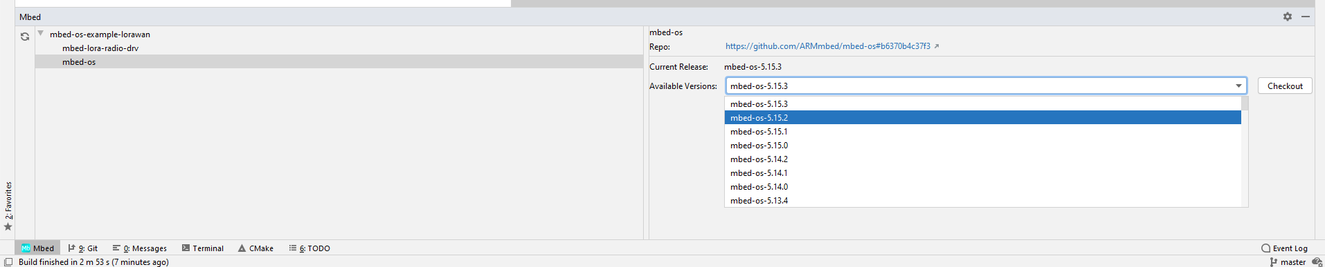 For managing Mbed OS packages a tool window labeled "Mbed" exists at the bottom of the screen. It provides a tree view of all dependencies of the project and allows changing the version of dependencies and sub dependencies.