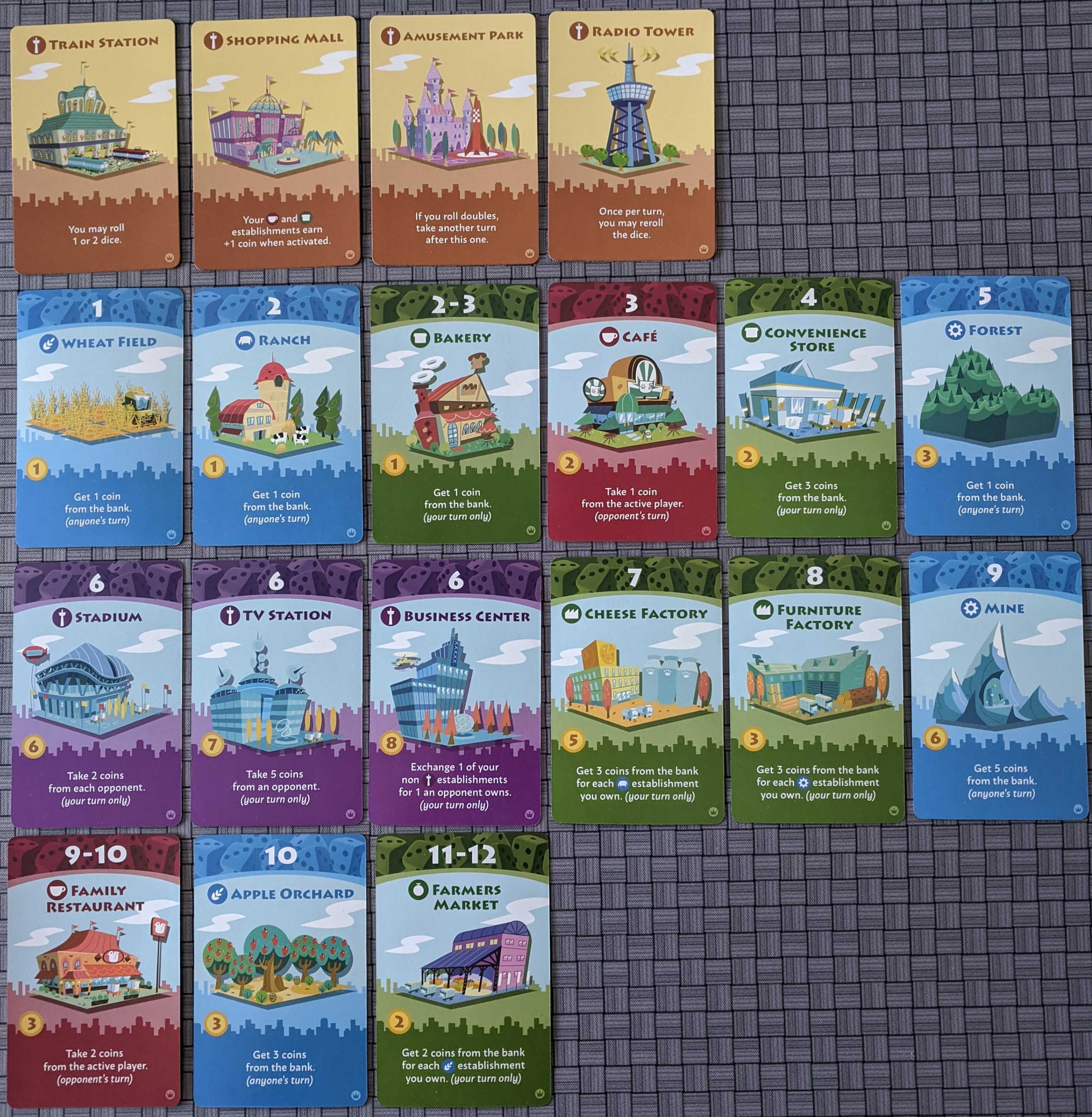 The Phase 2 version of the game builds on Phase 1 by adding the Bakery, Convenience Store, Mine, and Apple Orchard. Players start with a single Wheat Field and Bakery, with 6 of each of the seven establishments in the market. It also includes the Train Station to go along with the City Hall landmark. The first player to complete both landmarks wins the game. (Note that the Train Station allows players to roll 1 or 2 dice, and there are establishments that require two dice to activate.)
